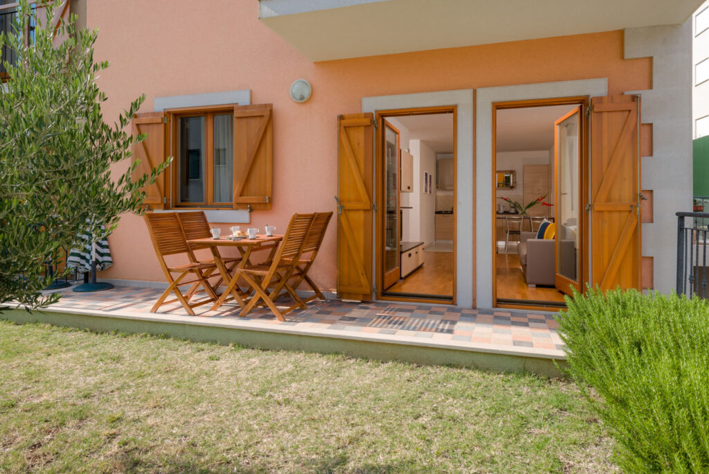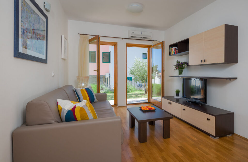 Smještaj za 2+2 osobe; 50 m2, u prizemlju, lijepo i udobno uređen: dnevni boravak / blagovaona , dvosjed na razvlačenje (2 x 80 cm x 190 cm), SAT/LCD, klima uređaj, izlaz u vrt. Otvorena kuhinja (2 ploče, zamrzivač), 1 soba s francuskim krevetom (160 cm x 200 cm). Kupaonica s tuš kadom.