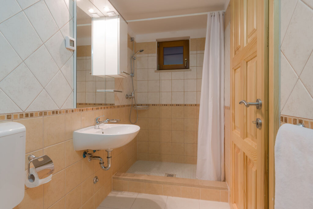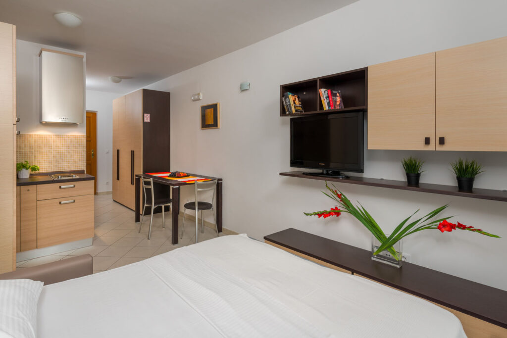 Smještaj za 2 osobe; 30 m2, u prizemlju, lijepo i udobno uređen: krevet (160 cm, dužina 190 cm), stolom za blagovanje i TV-om sa sat. prijemnikom (plosnatim TV ekranom), klima uređajem. Otvorena kuhinja (2 ploče za kuhanje, zamrzivač). Kupaonica s tuš kadom.