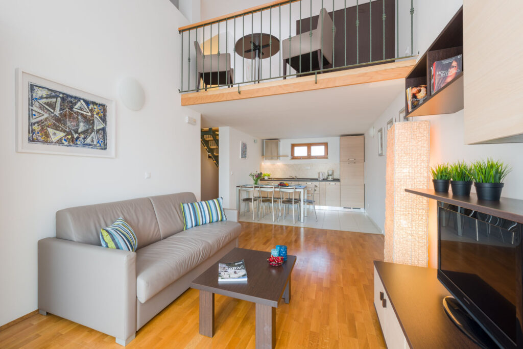 Smještaj za 2+2 osobe, 40m2 na dvije etaže; Dnevni boravak / blagovaona , kauč na razvlačenje (150 cm x 190 cm), sat/LCD. Otvorena kuhinja (2 ploče, zamrzivač). Kupaonica s tuš kadom. Galerija: bračni krevet (160 x 200 cm). Pojedini apartmani ovog tipa imaju balkon.