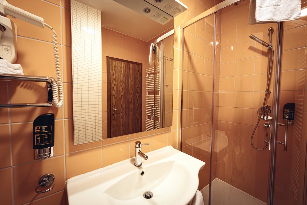 Dvokrevetna soba opremljena je s bračnim krevetom ili dva odvojena kreveta, krevetom na kat u kojoj se nalazi TV. Kupaonica s tušem ili kadom, WC-om, sušilom za kosu.